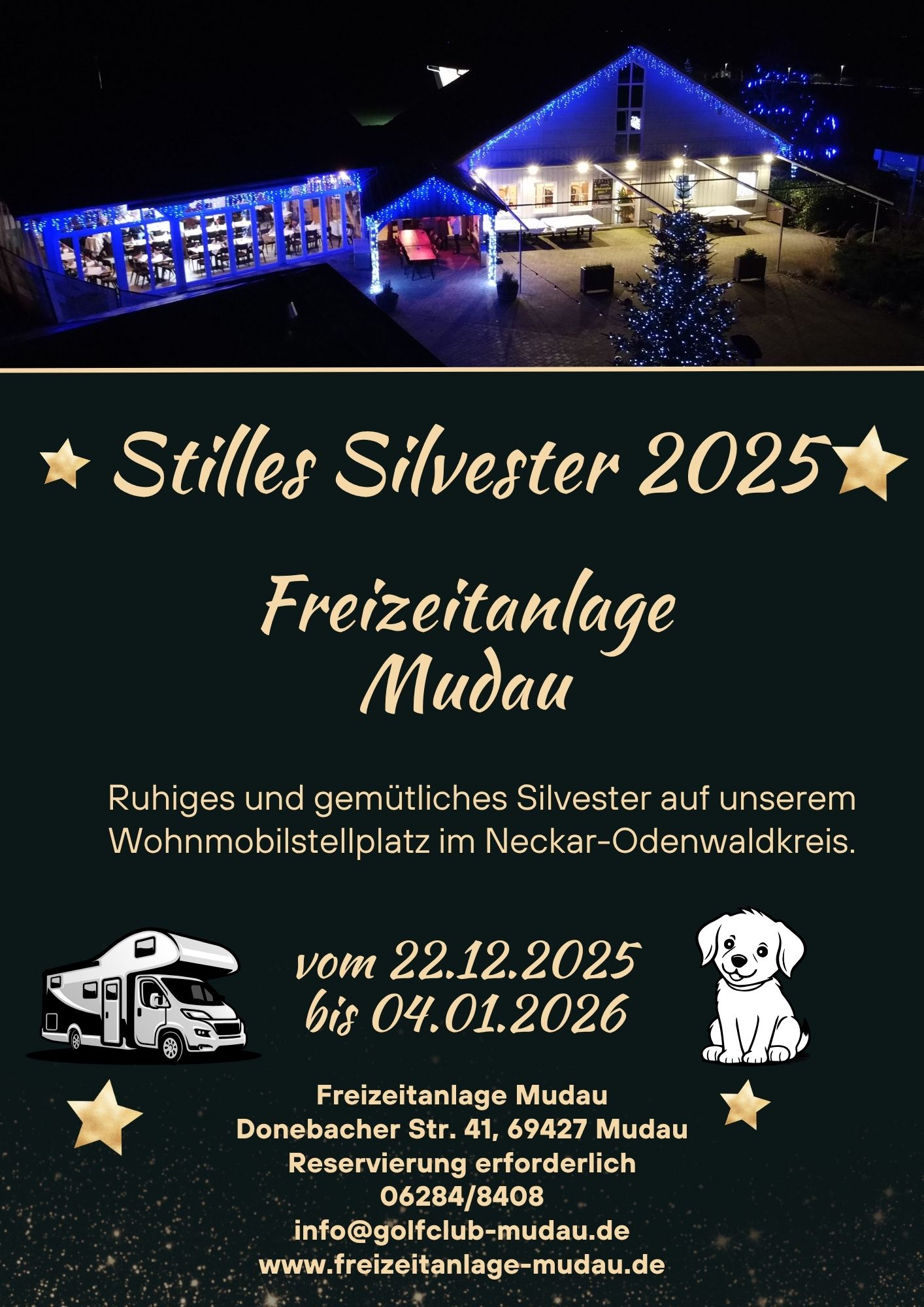 Alle verfügbaren Stellplätze sind inzwischen vollständig vergeben – vielen Dank an alle, die bereits gebucht und ihre Zahlung abgeschlossen haben. Wir freuen uns jetzt schon darauf, gemeinsam mit euch eine ruhige und besinnliche Jahreswende zu verbringen.